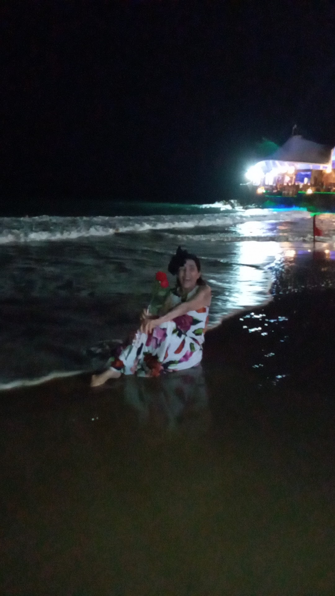 Mi hermano, su esposa, mi hija, yerno y Chipi, Diana, mi nieta, la prima. Parte del repertorio, parte del equipo de luminitos, fotógrafos, camarógrafos family style, y hasta los comensales en los restaurantes luminosos a las orillas miraban por los vitrales de los ventanales sin privarse de las ganas de acercarse para satisfacer la curiosidad de lo que ante sus ojos tenían tras comenzar el primer episodio. Llamativo ese estar sobre la arena mientras las olas se posaban sobre mis pies mientras los volantes acampanados de la falda de mi traje se dejaban humedecer al compás de cada ola. Absolutamente de las 10 pm. El traje-reliquia quedará guardado para el recuerdo.